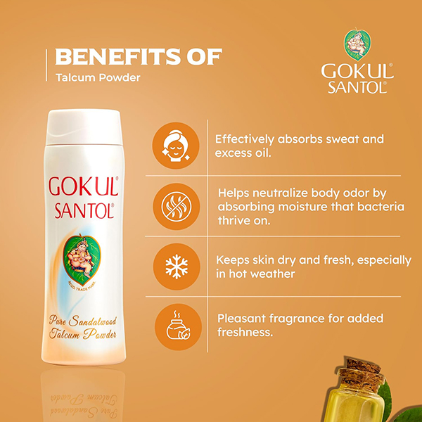 Gokul Santol Pure Sandalwood Talcum Powder | 300g | Long-Lasting Soothing Fragrance | Natural Sweat & Oil Absorption | Refreshing & Healthy Glowing Complexion